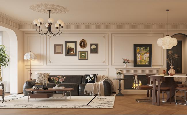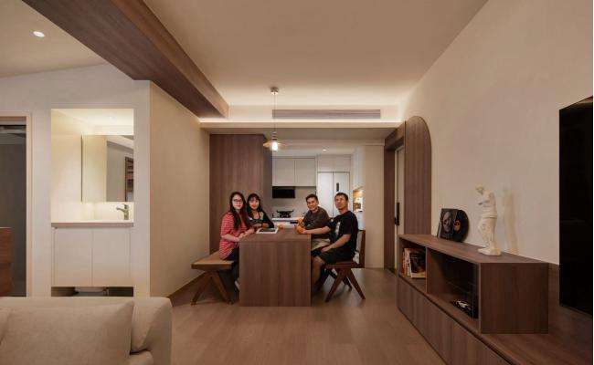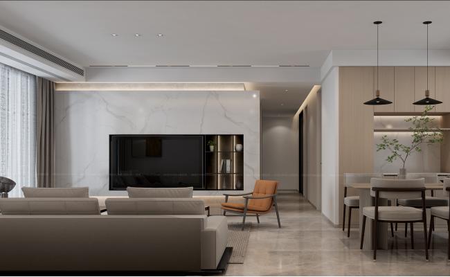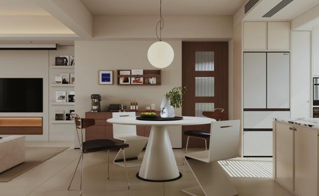 業主是一對年輕夫妻,喜歡有格調且帶些復古的元素,整體采用現代中古風格加一些包豪斯的概念,形成一種獨特而富有魅力的設計風格,在設計整體上注重簡潔有型,不管在硬裝造型上還是家具裝飾上,基本以抽象的幾何體塊和有機曲線結合