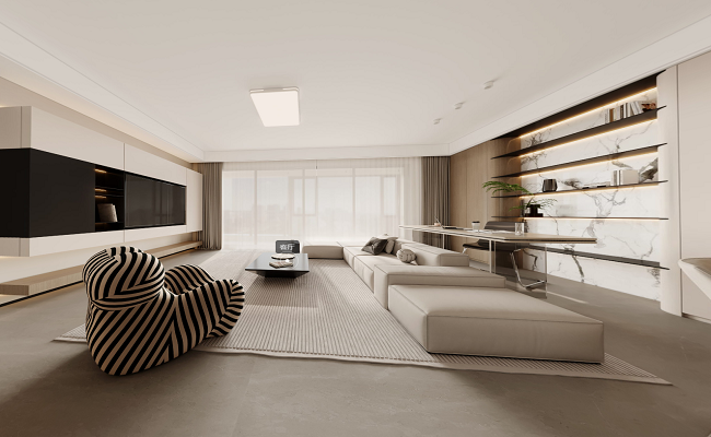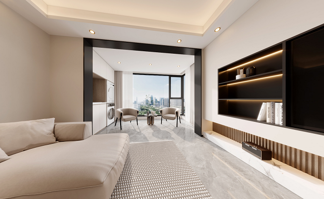 客廳采用開放式布局,并將陽臺整體納入,極大提升了空間的通透性與采光率,營造明亮而舒展的氛圍。墻面選用藝術漆,搭配自然溫潤的木質元素,共同構建出層次豐富、細膩柔和的肌理質感。