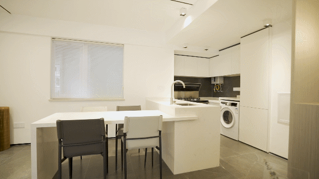直接從操作臺延展出餐桌,形成連貫化設計,充分節(jié)省空間。餐廚空間也有了更加直接的互動,閑來下廚聚會,女主人與親朋好友擁有了更多的交流空間,在島臺上沖沖咖啡、在餐桌邊品品小酒,悠然自得。
