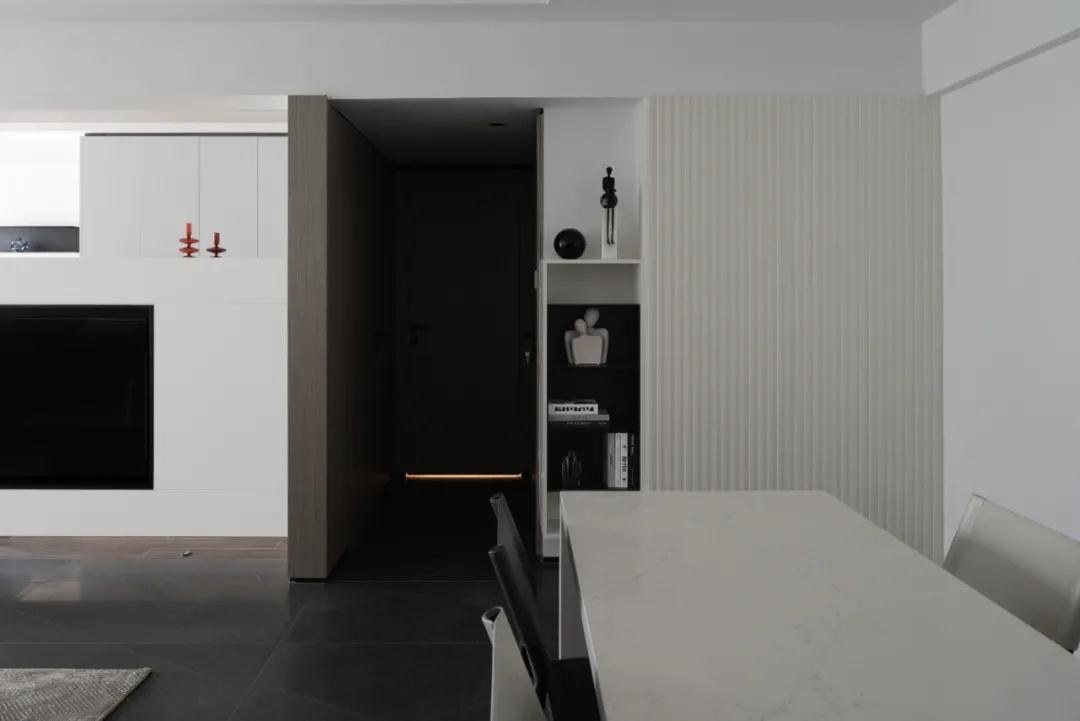 在承載了重要生活場景的餐廚區(qū)域,設計師直接把玻璃門和墻體打掉之后,開放式廚房搭配島臺設計,將整個餐廚空間融為一體,顯得通透、明亮。通過輕松簡約的造型與黑白灰的色調來呈現空間里的都市感。