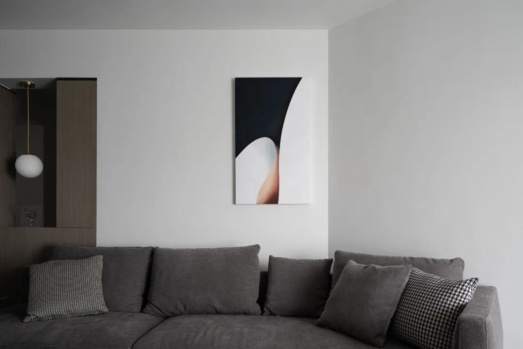 設計師選擇拐角沙發(fā)弱化了客廳異型結構,完美解決鉆石角所造成的尖銳感,變缺陷為亮點。墻上的抽象畫為整個空間增添了藝術的氣息,給原本稍顯寡淡色調加了精彩的一筆。