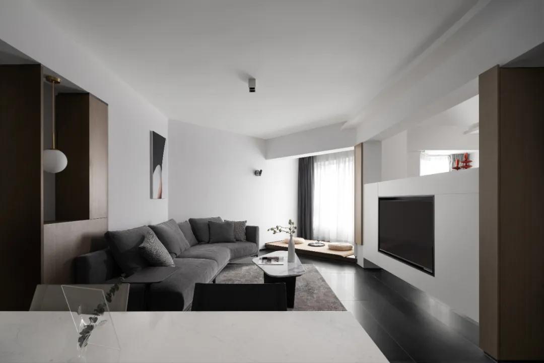 不規(guī)則沙發(fā)+半墻電視柜,地臺打造休閑空間