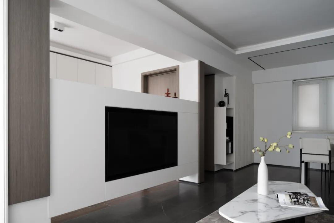 電視背景墻只做了半墻高,并且地面稍為留空,懸浮的感覺令小戶型客廳看起來更為輕盈,也為后面的書房引入更多光線。