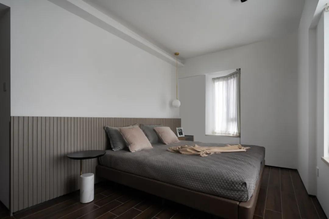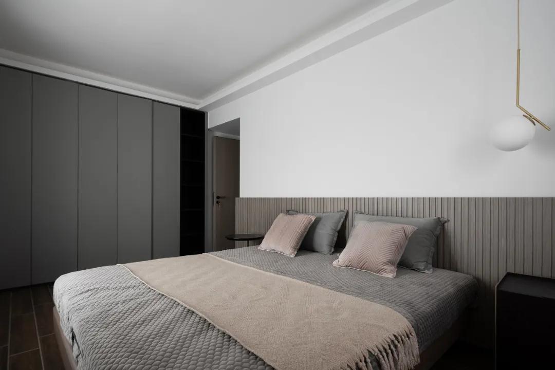 主臥就設計比較簡單了,床靠后以半墻條紋型的護墻板做裝飾,在簡潔的空間中點綴以適當的肌理細節(jié),濃淡相宜。
