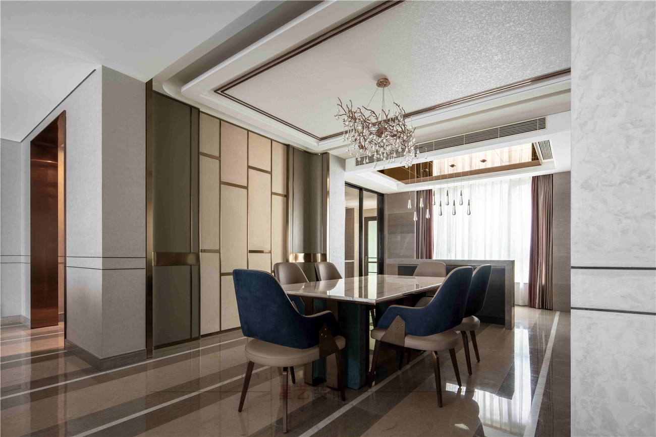 用餐區(qū)則把輕奢主義發(fā)揮到及至,首先就是金屬質(zhì)感的鑲嵌紋理,和富麗堂皇的水晶燈,都是業(yè)主最愛的元素之一,為即將入住的新婚夫妻帶來滿滿的浪漫氣息。