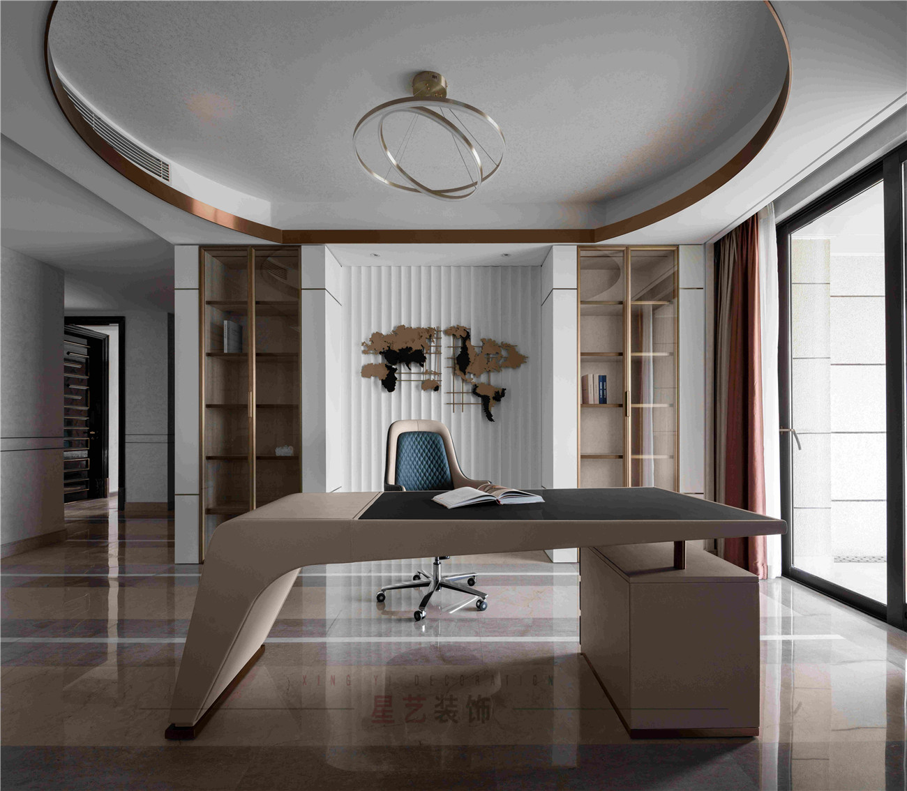 想要過上向往的生活,工作就顯得總是無處不在,辦公區(qū)是在家中辦公或者看書的地方。這樣充滿的科技感的辦公桌就備受年輕人的喜愛,尤其是跟客廳相呼應(yīng)的圓形吊燈和棕色邊框的修飾,直接把整體的時尚度拉滿,同時寬闊獨立的空間更是減緩了工作壓力帶來的壓迫感。