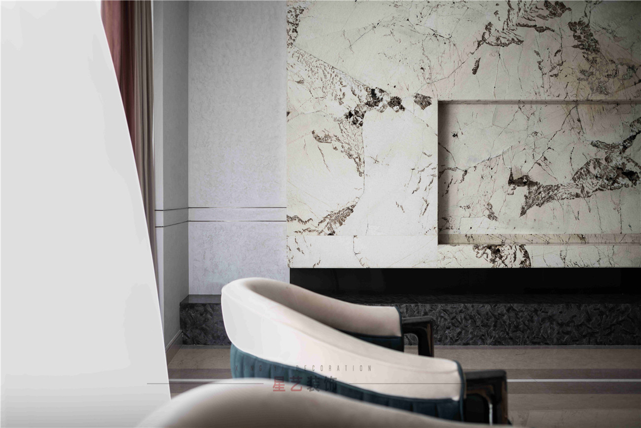 光滑有質(zhì)感的沙發(fā),搭配上同色系的矮桌讓整體的色調(diào)更加協(xié)調(diào),而且?guī)в谢⌒蔚纳钌q面座椅,和精心設(shè)計的圓形吊燈,打破了四四方方桌子和沙發(fā)帶來的頓感,如潑墨山水般的人大理石紋理給整個客廳增添奢華的格調(diào)。