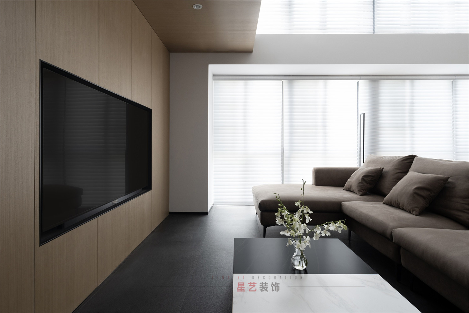 客廳:簡潔的設計,大面積的百葉窗制造極好的光影效果,不管任何天氣都擁有最佳的采光,內嵌的電視機搭配下沉式空間的處理手法帶給業主沉浸的舒適體驗,主色調黑白灰,在各個區域中都有獨立的對應系,精簡而規整,大方而得體。