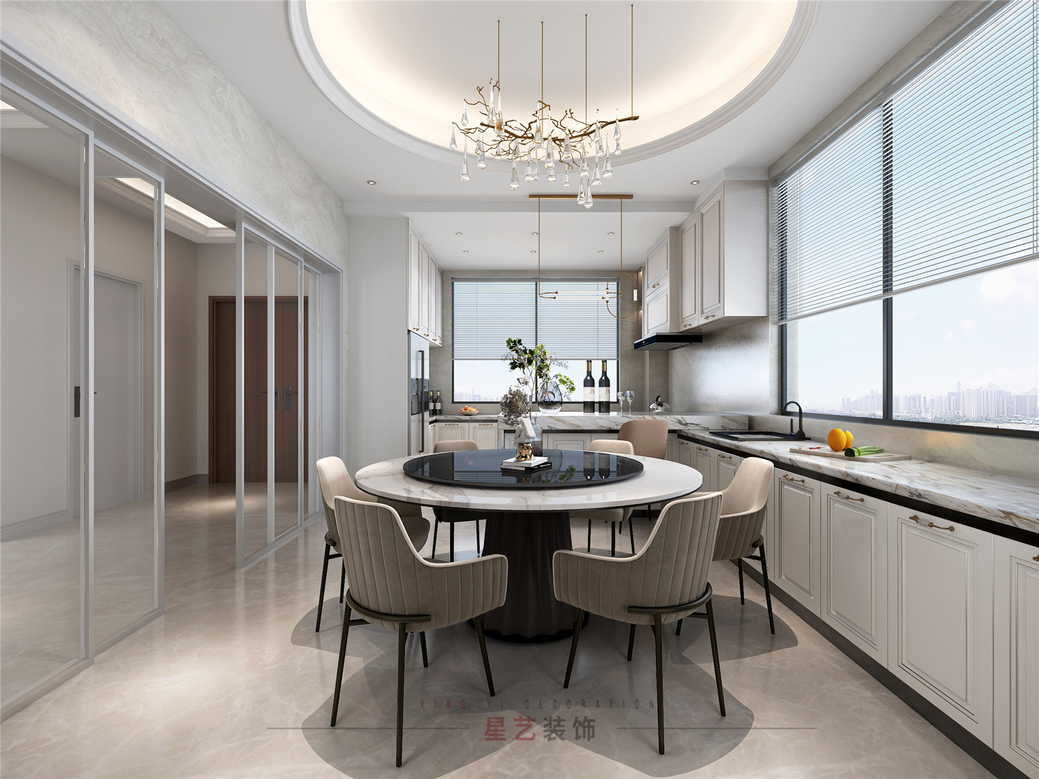 宴席區(qū)與工作區(qū)相連,也是業(yè)主讀書會客的重要場所,整體空間層次豐富,動線流暢,大理石臺面搭配白色櫥柜,簡約耐看