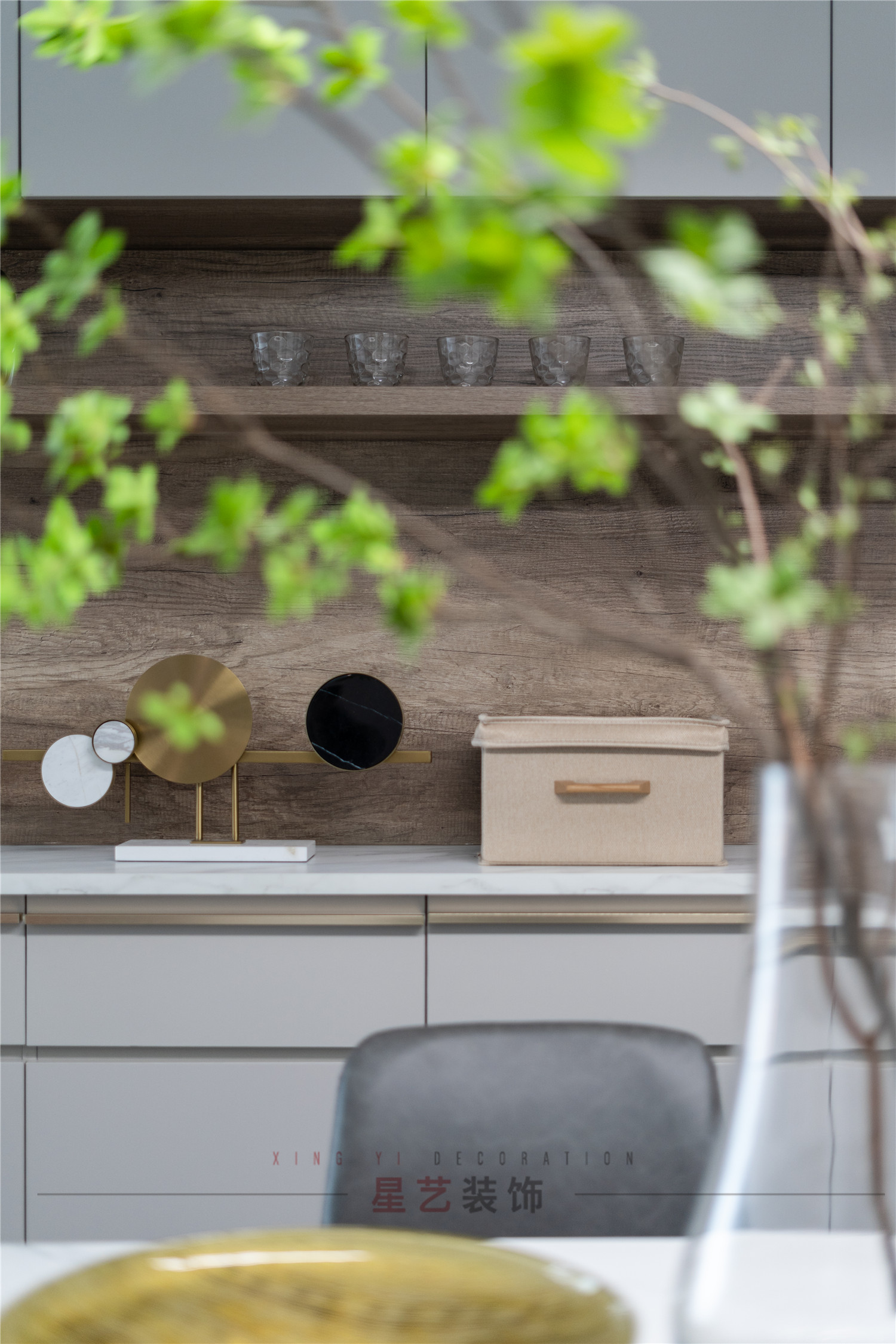 煥然一新的用餐區(qū)簡約清新,整面的置物柜中間設置置物臺,最常用的東西都方便觸手可得,也可以放喜愛的擺件,整體沒有繁復的設計,只有最貼近人間煙火的靜謐氣息。