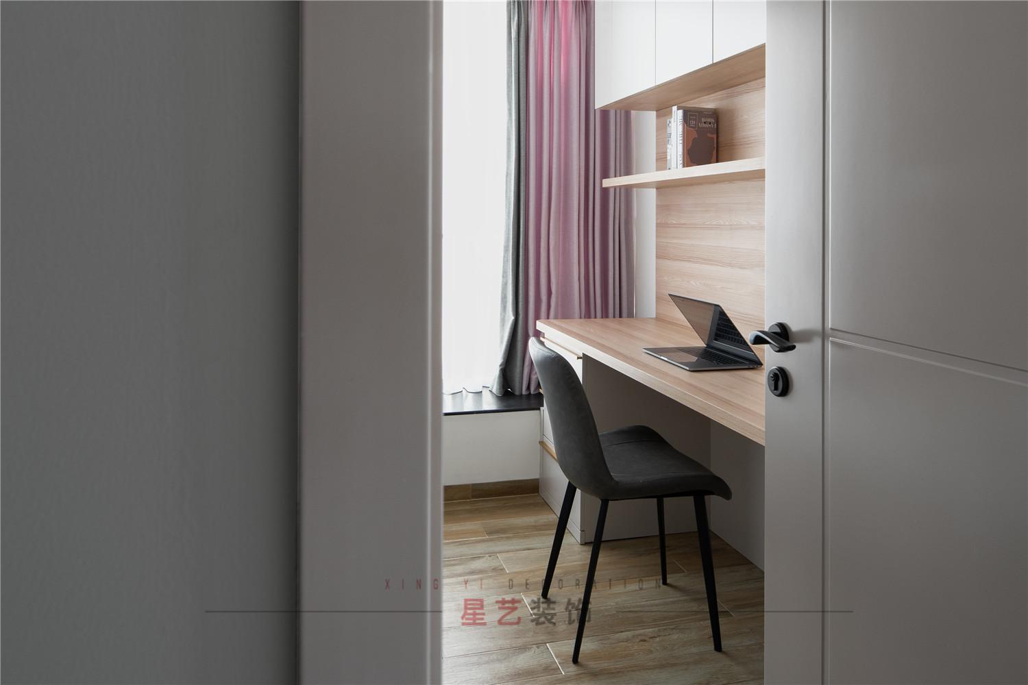 由于工作原因,業(yè)主對房間內(nèi)的最大需求就是大的書桌,在格局上稍微做了調(diào)整。原木書桌會更加敞亮柔和,有層次感的色彩也能減少工作或者閱讀的疲勞感。體驗休憩于家的那份寧靜與愜意。