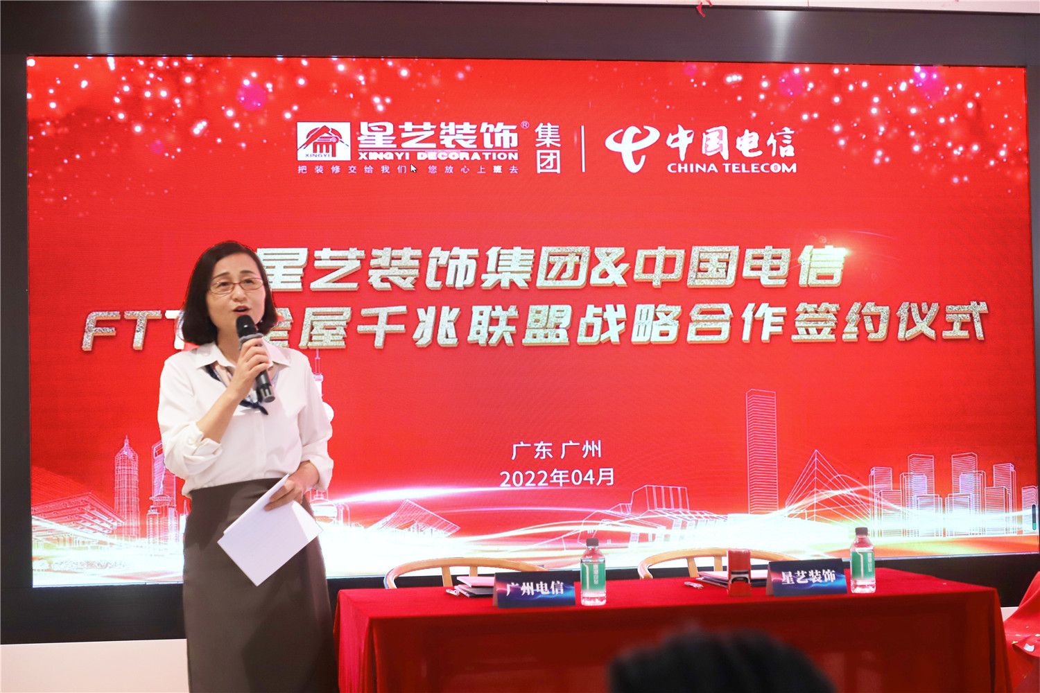 簽約儀式現(xiàn)場,星藝裝飾廣州分公司總經(jīng)理柯志強、星藝裝飾廣州分公司副總經(jīng)理劉亦萍,中國電信廣州分公司關(guān)堅成分別進行了致辭發(fā)言。