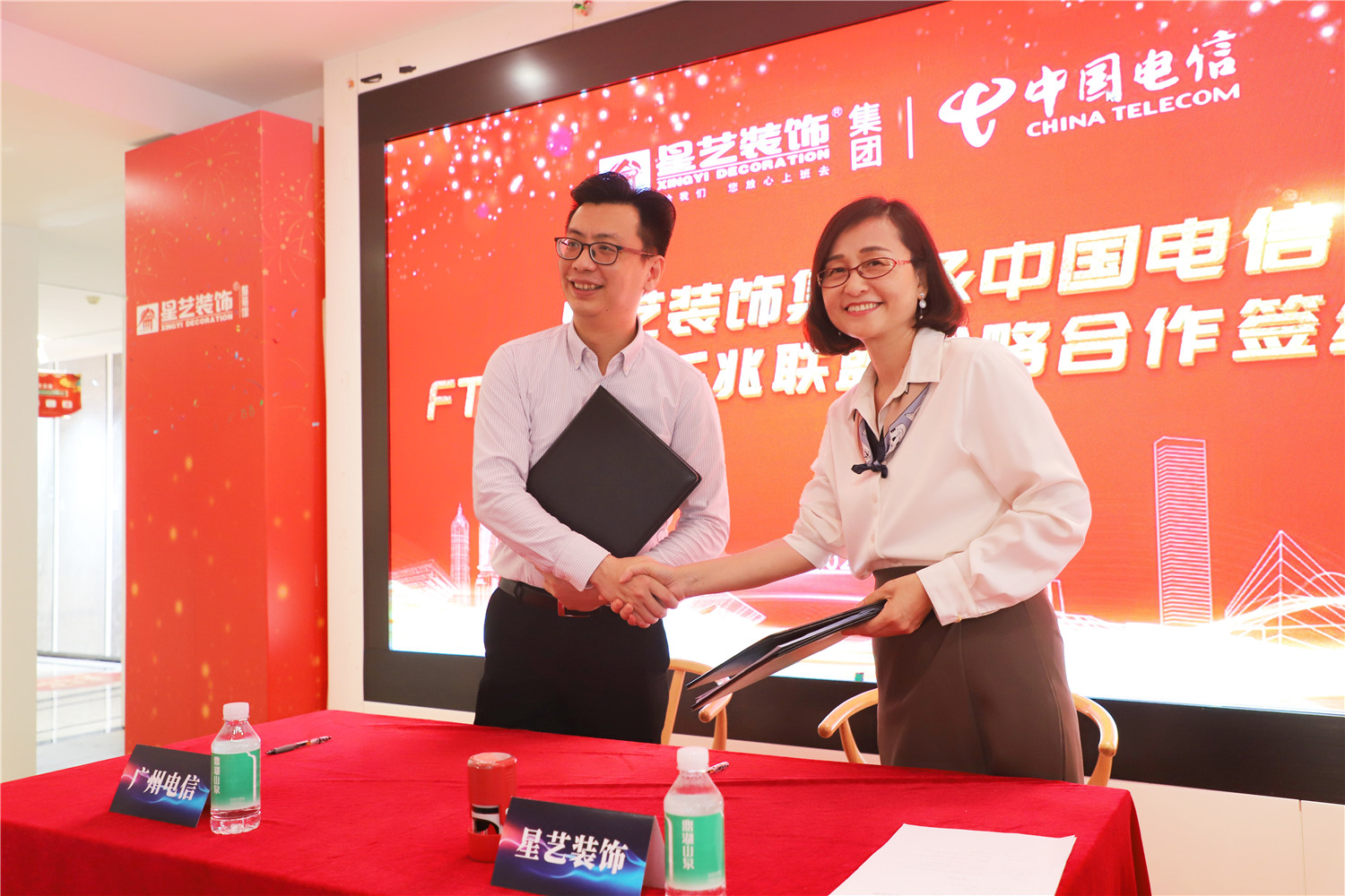 在現(xiàn)場嘉賓的共同見證下,星藝裝飾廣州分公司副總經(jīng)理劉亦萍和中國電信廣州分公司創(chuàng)新中心總經(jīng)理李應(yīng)春代表雙方在戰(zhàn)略協(xié)議書上簽字,開啟了戰(zhàn)略合作的新篇章!
